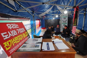 [한국농정신문 장수지 기자] 국가기간 전력망 건설 추진계획이 확정되고 34만5000V(345kV) 초고압송전선로 입지가 가시화되며 경과대역 농민들과 주민들의 투쟁 또한 거세지고 있다.특히 지난 9월 8일, 출범 직후부터 광폭 행보를 보이고 있는 고압 송전선로·철탑 건설 반대 영암군 대책위원회(위원장 정철, 영암대책위)는 9월 10일경부터 지금까지 매일 아침 8시 한국전력공사 나주 본사 앞에서 피켓시위를 진행 중이다. 정철 위원장은 강추위가 엄습한 지난 18일에도 상복을 입고 한 시간가량 상여소리와 함께 투쟁을 벌였다.영암군대책위에