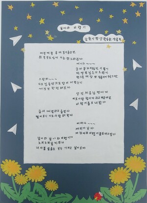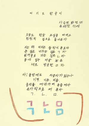 물무든 손을 흔들든 너자근등 미러내서 미안햇어눈물 흐르던 네 눈동자내 주름 사이에 아직도 있다내 자석아남자 손 거튼 손으로엄마는 이제 공부하러 다닌다 삶의 애환이 담긴 농민들의 손편지, 그림, 시 등 소소하지만 감동있는 작품을 ‘한글꽃이 피었습니다’에서 소개합니다. 게재를 원하는 농민이나 관련단체는 신문사 전자우편(kplnews@hanmail.net)으로 연락주시기 바랍니다.