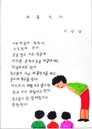 나는 며칠에 한번씩노인정에 간다.문을 열고 나는 정중히허리를 굽혀서 손을 배꼽에 대고“안녕하세요” 한다.친구들이 나의 배꼽인사를 받고웃으며 박수를 친다.어디가서 배웠냐고 물으면학교 가서 배웠다고 한다.친구들이 참 잘 배웠다고칭찬한다. 삶의 애환이 담긴 농민들의 손편지, 그림, 시 등 소소하지만 감동있는 작품을 ‘한글꽃이 피었습니다’에서 소개합니다. 게재를 원하는 농민이나 관련단체는 신문사 전자우편(kplnews@hanmail.net)으로 연락주시기 바랍니다.
