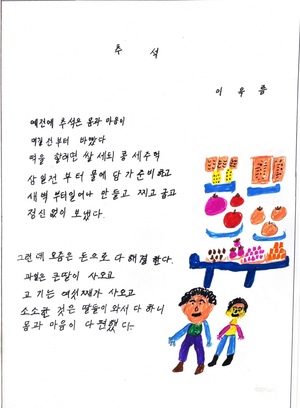 예전에 추석은 몸과 마음이며칠 전부터 바빴다떡을 할려면 쌀 세 되 콩 세 주먹삼일전부터 물에 담가 준비하고새벽부터 일어나 만들고 찌고 굽고정신없이 보냈다.그런데 요즘은 돈으로 다 해결한다.과일은 큰딸이 사오고고기는 여섯째가 사오고소소한 것은 딸들이 와서 다 하니몸과 마음이 다 편했다. 삶의 애환이 담긴 농민들의 손편지, 그림, 시 등 소소하지만 감동있는 작품을 ‘한글꽃이 피었습니다’에서 소개합니다. 게재를 원하는 농민이나 관련단체는 신문사 전자우편(kplnews@hanmail.net)으로 연락주시기 바랍니다.