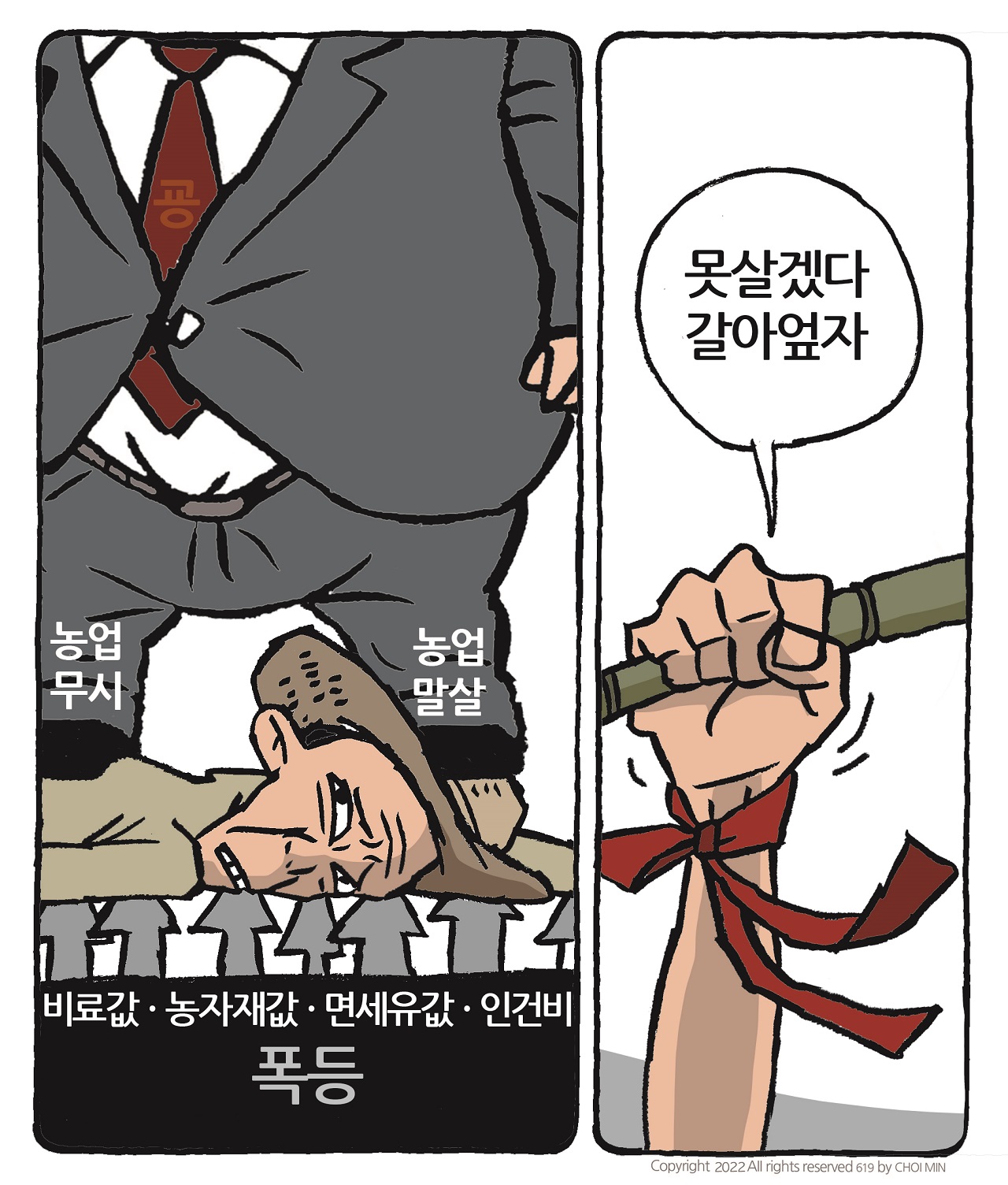 바로가기 URL 다른 공유 찾기 기사스크랩하기 가 가 이 기사를 공유합니다 페이스북(으)로 기사보내기 트위터(으)로 기사보내기 URL복사(으)로 기사보내기 닫기 키워드 #한국농정신문 #한국농정 #만평 #최민 #농민그림판 #쌀값 #윤석열정부 #농업무시 #농업말살 최민 작가 다른기사 보기 저작권자 © 한국농정신문 무단전재 및 재배포 금지 관련기사 거리에 선 1만5천 농민의 생존권 투쟁 “이대로면 파산 위기” 농민들, 전국농민대회서 대정부 투쟁 선포 생산비는 폭등하는데 … 마늘·양파 생산자 “TRQ 수입 중단하라” 거리에 선 1만5천 농민의 함성 “농민무시 윤석열정권 갈아엎자” 개의 댓글 회원로그인 작성자 비밀번호 댓글 내용입력 댓글 정렬 최신순 추천순 답글순 BEST댓글 BEST 댓글 답글과 추천수를 합산하여 자동으로 노출됩니다. 닫기 더보기 댓글삭제 삭제한 댓글은 다시 복구할 수 없습니다. 그래도 삭제하시겠습니까? 비밀번호 닫기 댓글수정 댓글 수정은 작성 후 1분내에만 가능합니다. 본문 / 400 비밀번호 닫기 내 댓글 모음 닫기