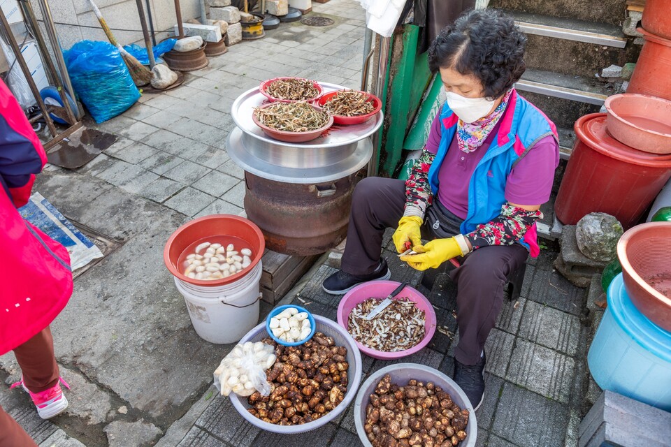 제일 먼저 눈길을 끈 것은 여기저기 산더미 같이 쌓인 토란대다. 어머어마한 한 다발이 5000원이다. 싸지만, 사서 들고 가기 힘들고 돌아가서 손질한 생각을 하면 쉽게 구입을 결정하지 못할 것이다. 그래서 토란대를 들고 나오신 분들은 열심히 껍질을 까고 손질하면서 파신다. 당장 쓸 일도 없고 마을에서도 구할 수 있으니 나는 그냥 지나간다. 토란대가 나왔으니 당연히 토란도 보인다. 토란도 토란대 같아서 다들 장갑 끼고 열심히 까면서 파신다. 맨손으로 만지면 미끄러워 불편하고 또 직접 만진 손이 가려울 수 있으니 조심해야 한다. 조금 사다가 토란탕 끓이면 좋겠지만 이번엔 외면하고 간다.