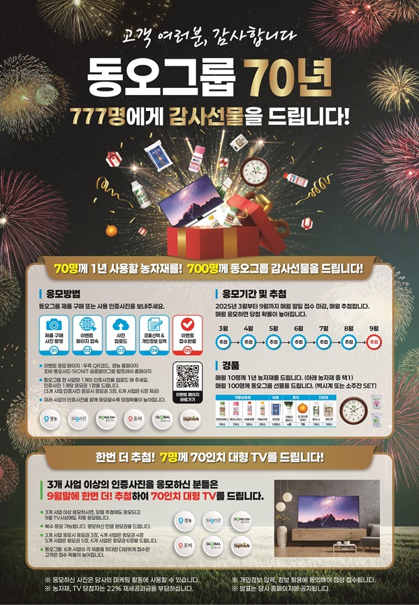 융복합 토탈솔루션 전문기업 동오그룹이 창립 70주년을 맞아 고객 감사 특별 이벤트를 진행한다. 동오그룹은 오랜 시간 변함없이 함께해 준 고객들에게 보답하기 위해 이번 행사를 마련했다고 밝혔다.