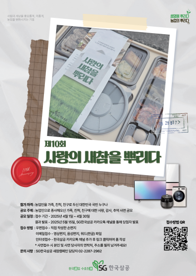 새참캠페인 사연 공모는 SG한국삼공(주) 카카오톡 채널에서 참여하면 된다. 사연 응모자와 당선자를 위해 새참도시락 및 대형 LED TV, 김치냉장고, 드럼세탁기 등 많은 경품이 준비돼 있다.