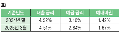 가계 대출 관리 강화라는 정부 기조 아래 대출 금리는 굳건한데, 예금 금리만 뚝 떨어지니 농민들의 한숨이 깊어만 간다. 경기침체 우려 속 이러한 예대마진 확대는 농업 경제를 더욱 압박하는 뇌관이 될 수 있다(<표1> 참고).