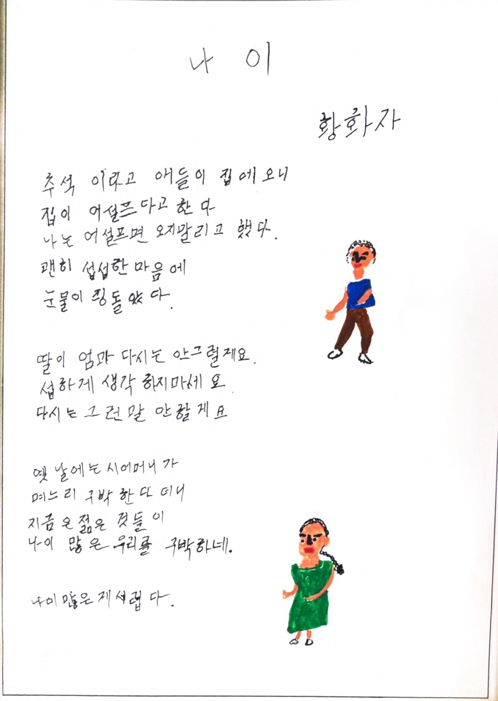 삶의 애환이 담긴 농민들의 손편지, 그림, 시 등 소소하지만 감동있는 작품을 ‘한글꽃이 피었습니다’에서 소개합니다. 게재를 원하는 농민이나 관련단체는 신문사 전자우편(kplnews@hanmail.net)으로 연락주시기 바랍니다.