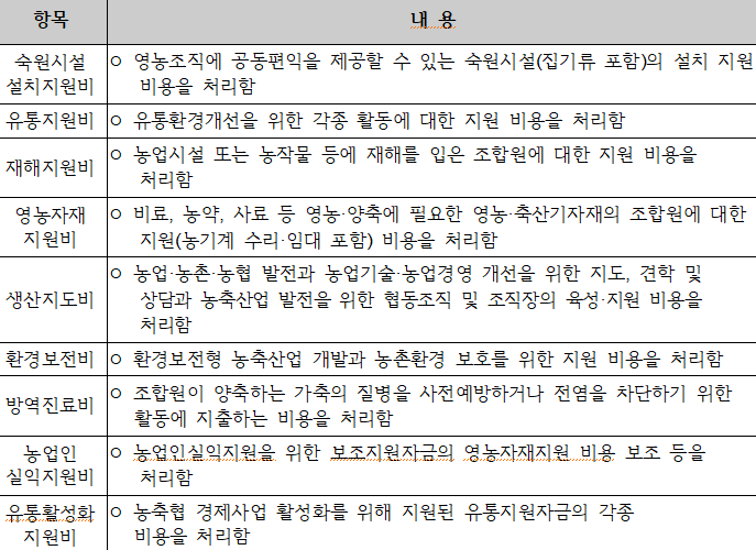 실익성 비용 : 숙원시설 설치지원비, 유통지원비, 재해지원비, 영농자재지원비, 생산지도비, 환경보전비, 방역진료비, 농업인 실익지원비, 유통활성화 지원비 등